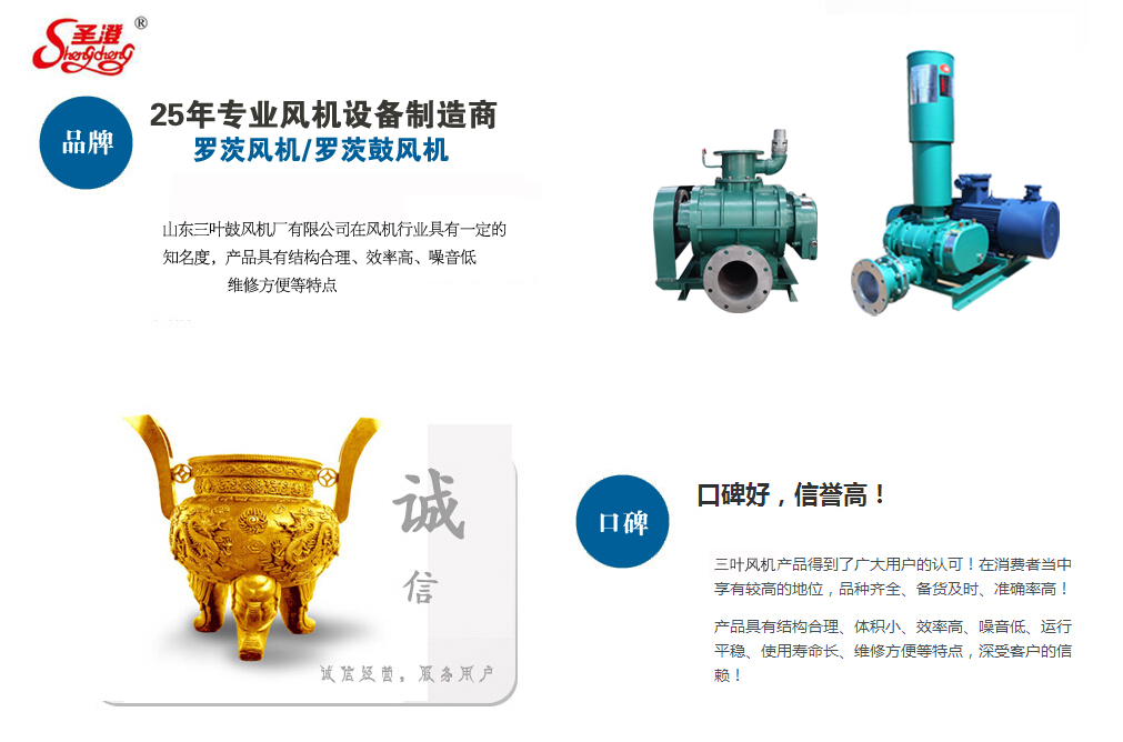 山東三葉鼓風機廠有限公司(原章丘市三葉鼓風機廠)創建于1990年,是專業生產羅茨鼓風機、羅茨真空泵、增壓泵以及回轉式風機系列產品的廠家,南靠309國道、膠濟鐵路線,北接濟青高速公路,地理位置優越,交通便利。本公司本著“質量第一、誠信為本”的指導方針,經過十多年的發展,以過硬的產品質量,及時完善的售后服務已在市場中占領一席之地。本公司生產的風機噪音低、高效節能、外型美觀;風機進、排氣口采用螺旋形狀,使進排風過程按螺旋線的方向循序切入。產品具有結構合理、體積小、效率高、噪音低、運轉平穩、使用壽命長、維修方便等特點。歡迎各界朋友親臨公司洽談業務,指導工作,攜手并進共創美好未來!